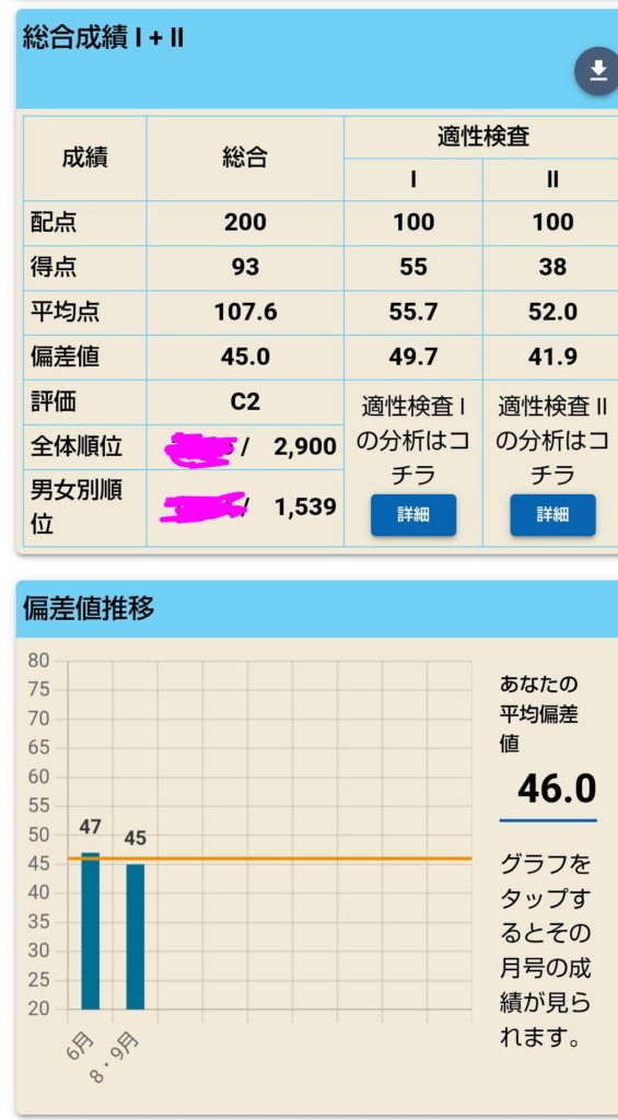 偏差値はとてもわずかですが下がりました。大きく46って書かれているけれど、グラフの所では偏差値45。